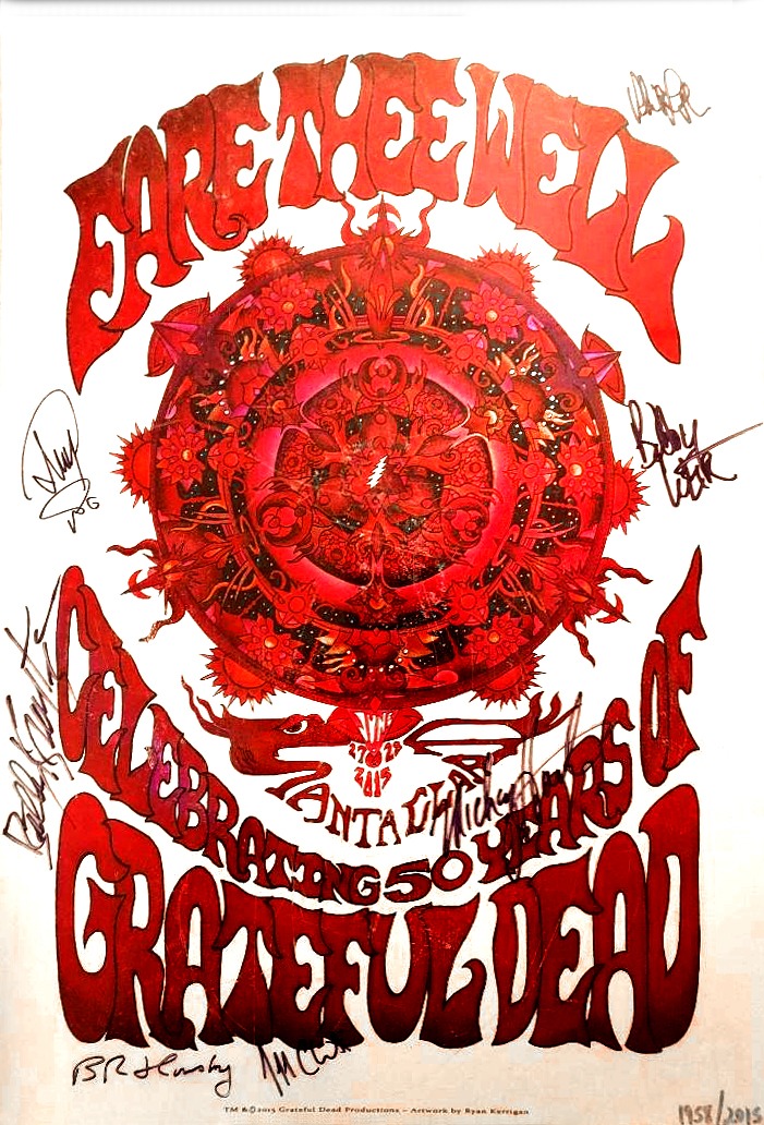 This stunning Fare Thee Well Red Foil Edition poster is an exceptional piece of music history. The picture simply canʻt do justice to just how cool the foil effect is on this unique poster! Designed by renowned artist Ryan Kerrigan, celebrated for his iconic work in the jamband and Phish communities, this poster is a true collector’s treasure. Kerrigan’s signature hand-drawn style blends psychedelic mandalas and his signature fish motif, evoking the spirit of the Grateful Dead while bridging the artistic gap between Deadheads and Phish fans.